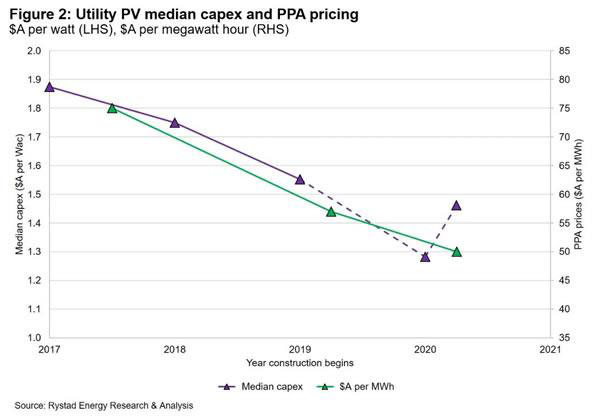光伏和風(fēng)電資產(chǎn)的大部分資本支出用于組件,約占光伏和風(fēng)電支出的60%和75%。由于組件通常以外幣計(jì)價(jià),澳元貶值對(duì)項(xiàng)目經(jīng)濟(jì)產(chǎn)生了重大影響。圖2突出了光伏資本支出與購電協(xié)議(PPA)定價(jià)相比隨時(shí)間變化的趨勢(shì)。