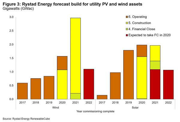 Rystad Energy預(yù)計(jì),到2020年初,將有2-3 GW的可再生能源項(xiàng)目實(shí)現(xiàn)財(cái)務(wù)結(jié)算并于今年開始建設(shè),其中包括1.1 GW的風(fēng)能和1-2 GW的光伏。