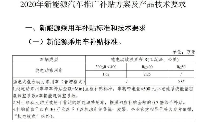 《通知》規(guī)定,新能源乘用車補貼前售價須在30萬元以下(含30萬元),才有資格享受補貼政策。2020年4月23日至2020年7月22日的過渡期期間,符合2019年技術指標要求但不符合2020年技術指標要求的銷售上牌車輛,按照《關于進一步完善新能源汽車推廣應用財政補貼政策的通知》(財建〔2019〕138號)對應標準的0.5倍補貼,符合2020年技術指標要求的銷售上牌車輛按2020年標準補貼。補貼車輛限價規(guī)定過渡期后開始執(zhí)行。