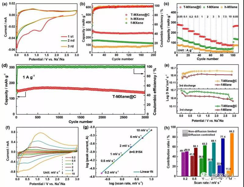 圖5 T-MXene@C的電化學儲鈉性能:(a)循環(huán)伏安曲線,(b)50 mA g-1下的循環(huán)性能(c)倍率性能,(d)1 A g-1下的長循環(huán)性能,(e)通過GITT曲線計算得到的鈉離子擴散系數(shù),(f)不同掃速下的循環(huán)伏安曲線,(g)Log(i)與Log(v)的擬合曲線,(h)不同掃速下的電容行為貢獻比例圖