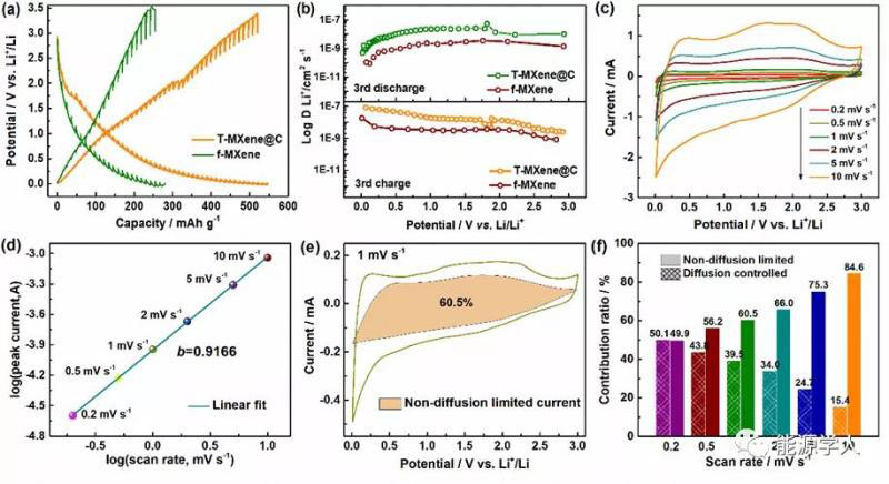 圖4 T-MXene@C的動力學儲鋰機理分析:(a)GITT曲線,(b)通過GITT曲線計算得到的鋰離子擴散系數(shù),(c)不同掃速下的循環(huán)伏安曲線,(d)Log(i)與Log(v)的擬合曲線,(e)1 mV s-1下電容行為的貢獻比例圖,(f)不同掃速下的電容行為貢獻比例圖