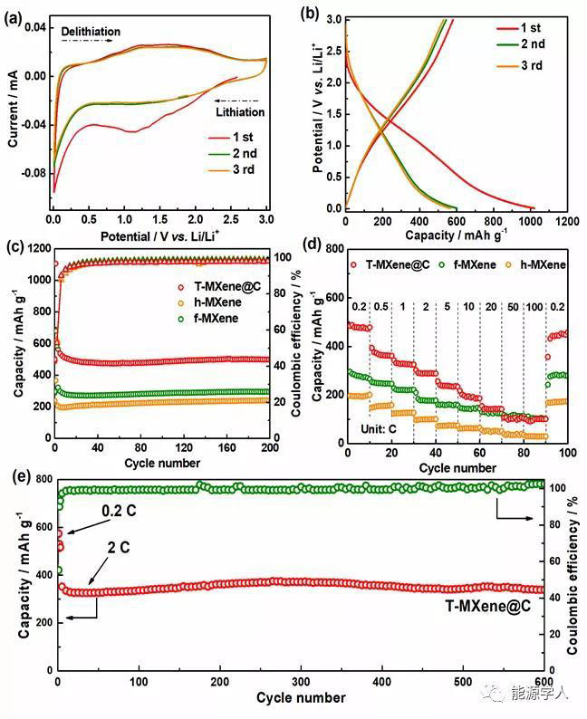 圖3 T-MXene@C的電化學儲鋰性能:(a)循環(huán)伏安曲線,(b)充放電曲線,(c)0.2 C下的循環(huán)性能,(d)倍率性能,(e)2C下的長循環(huán)性能