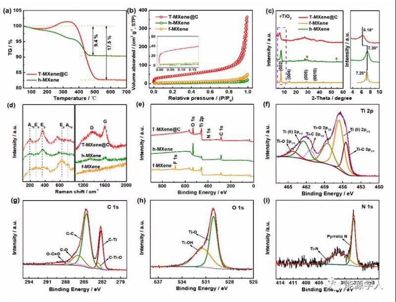 圖2(a)T-MXene@C和h-MXene的熱重曲線;T-MXene@C、f-MXene和h-MXene的(b)氮吸附/脫附曲線、(c)XRD譜圖、(d)Raman譜圖和(e)XPS譜圖;T-MXene@C的高分辨XPS譜圖:(f)Ti 2p、(g)C 1s、(h)O 1s和(i)N 1s