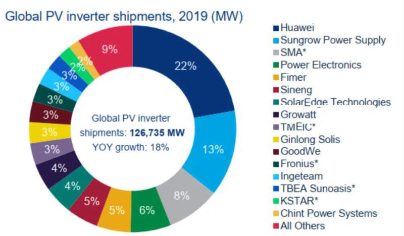 近日,能源調(diào)研機構(gòu)Wood Mackenzie發(fā)布了《全球太陽能光伏逆變器市場:2020年市場份額和出貨量趨勢報告》,2019年全球逆變器的出貨量為126.735GW,同比增長18%。各品牌占比如下圖所示。