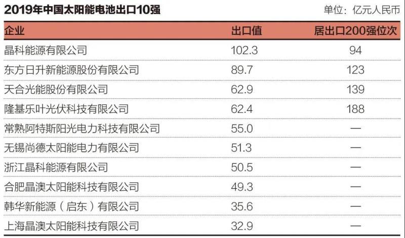 2、2019年中國光伏組件出口額排名