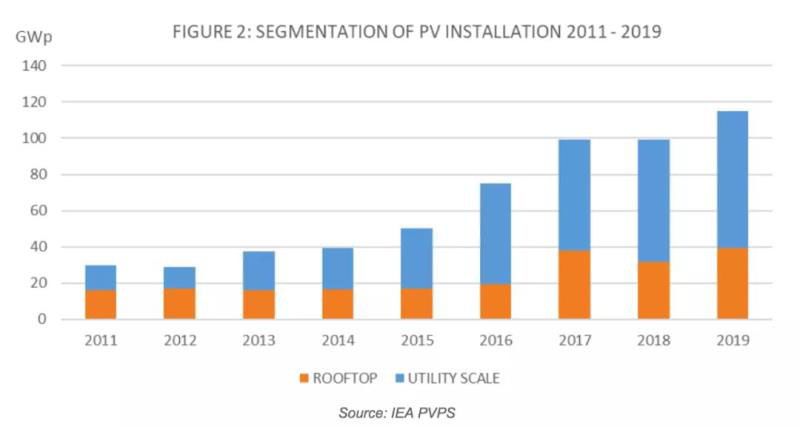 2019年,全球光伏裝機值為114.9GW,累計裝機達到了627GW。