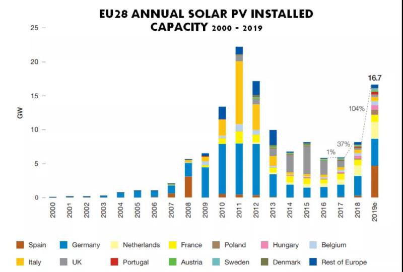 海外市場則從2018年的58.8GW提高到了2019年的84.9GW,增長幅度為44%。其中,歐盟裝機接近16GW,歐洲其余地區(qū)約為5GW。