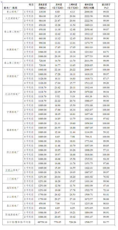 (3)本表最后一行的“合計(jì)值/整體值/平均值”,即:裝機(jī)容量、發(fā)電量、上網(wǎng)電量為各機(jī)組合計(jì)值,核電設(shè)備利用小時(shí)數(shù)為全部機(jī)組整體值,能力因子為全部機(jī)組的算數(shù)平均值。