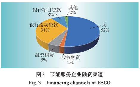 隨著節(jié)能服務(wù)公司承擔(dān)的項(xiàng)目單體量逐年增大,分享期逐年增長,資產(chǎn)負(fù)債率居高,加之抵押物較少,節(jié)能服務(wù)公司融資成本居高不下。據(jù)統(tǒng)計(jì), 中國21家主要銀行貸款總額僅有10%用于綠色項(xiàng)目,其中還主要是用于綠色交通、可再生能源等政府主導(dǎo)型大型項(xiàng)目。目前公共財(cái)政投入僅占融資需求的7.3%,未來5年融資缺口達(dá)到1.53萬億元。 據(jù)調(diào)研,有52%的節(jié)能服務(wù)公司尚未獲得過外部融資,節(jié)能服務(wù)企業(yè)融資渠道見圖3。平均融資成本 接近10%, 90%以上的節(jié)能服務(wù)公司存在不同程度的融資難融資貴問題。