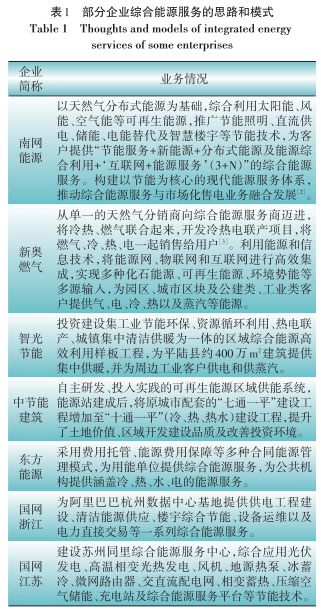 以國家電網(wǎng)、南方電網(wǎng)、中節(jié)能環(huán)保、智光電氣 等為代表的一批企業(yè)在綜合能源服務(wù)業(yè)務(wù)開展過程中,逐漸摸索出了自己的模式和路線。其服務(wù)內(nèi)容主要包括節(jié)能服務(wù)、分布式燃?xì)猓ɑ驘犭娐?lián)產(chǎn))、 儲(chǔ)能、分布式光伏等項(xiàng)目投資,增加一部分服務(wù)(如售電)及少數(shù)微電網(wǎng)(多能互補(bǔ)+調(diào)度控制)。部分企業(yè)開展綜合能源服務(wù)的情況見表1。