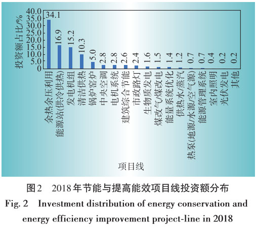 具體到項(xiàng)目線類型來看,投資額占比最高的前 5條項(xiàng)目線依次為:余熱余壓利用項(xiàng)目,占比34.1%; 能源站(供冷、供熱)建設(shè)運(yùn)維項(xiàng)目,占比16.9%;發(fā)電機(jī)組節(jié)能改造(通流、供熱)項(xiàng)目,占比15.2%;集中供熱項(xiàng)目,占比10.3%;鍋爐窯爐節(jié)能項(xiàng)目,占比5%,2018年節(jié)能與提高能效項(xiàng)目線投資額分布情況見圖2