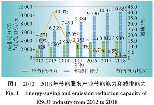2018年,節(jié)能服務(wù)項(xiàng)目形成年節(jié)能能力3 930 萬tee,比2017年增加3.1%,形成年減排二氧化碳能 力10 651萬t, 2012—2018年節(jié)能服務(wù)產(chǎn)業(yè)節(jié)能能 力和減排能力見圖1。