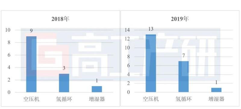 GGII認為,氫能與氫燃料電池產(chǎn)業(yè)在國內(nèi)也將參考并吸收以上路徑的部分經(jīng)驗與成果,從而加快國內(nèi)燃料電池產(chǎn)業(yè)的發(fā)展步伐。2019年國內(nèi)氫燃料電池空壓機實現(xiàn)百臺以上裝車出貨,氫循環(huán)、增濕器等還處于送樣測試階段,產(chǎn)品上車仍需時間。其他關鍵材料和部件方面,2019年國內(nèi)氣體擴散層的碳紙/碳布、質(zhì)子交換膜、催化劑等均未實現(xiàn)批量上車。2019年國內(nèi)空壓機和氫氣循環(huán)泵企業(yè)均新增4家,同時GGII調(diào)研發(fā)現(xiàn),2020年國內(nèi)市場向上游零部件和關鍵材料投資的積極性明顯提升。