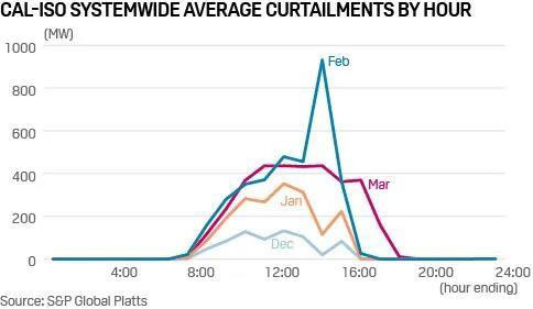 由于春季用電需求偏低,風(fēng)電和太陽能發(fā)電增加,同時受到春冬換季水電增發(fā)的影響,CAISO可再生能源季節(jié)性棄電增多。