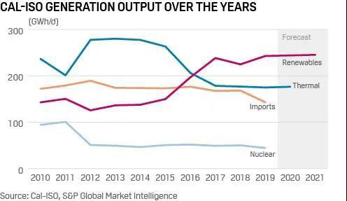 根據(jù)加州電力調(diào)度中心(CAISO)的數(shù)據(jù),可再生能源發(fā)電比例約為40%,處于全國領(lǐng)先水平,在過去十年中翻了一近番。與此同時,2019年可再生能源棄電量同比增長了一倍多,同年5月創(chuàng)下月度棄電量223195 MWh的紀(jì)錄。