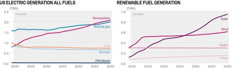 EIA預(yù)測,2021年可再生能源發(fā)電將超過核電和煤電,2045年將超過氣電。可再生能源發(fā)電比例預(yù)計(jì)將從2019年的19%增加到2050年的38%。