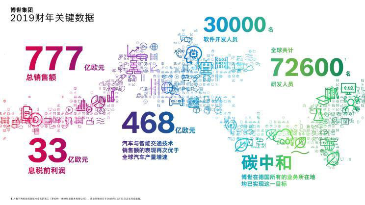 回顧2019財年,在全球經(jīng)濟(jì)發(fā)展持續(xù)低迷和汽車產(chǎn)量下降5.5%的大環(huán)境下,博世集團(tuán)整體銷售額達(dá)777億歐元(約5967億元人民幣),息稅前利潤總計33億歐元(約253億元人民幣)。2019年博世集團(tuán)研發(fā)支出61億歐元(約468億元人民幣),占整體銷售額7.8%。