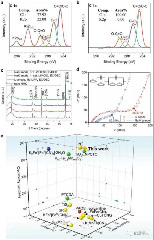 圖5. 在0.1C循環(huán)后,NMC/Na-K電池負極(a)和正極(b)的XPS結(jié)果;(c) NMC、Li和Na-K在不同條件下的XRD圖譜;(d) NMC/Na-K電池和NMC/Li電池的阻抗譜;(e)鉀離子電池性能的比較