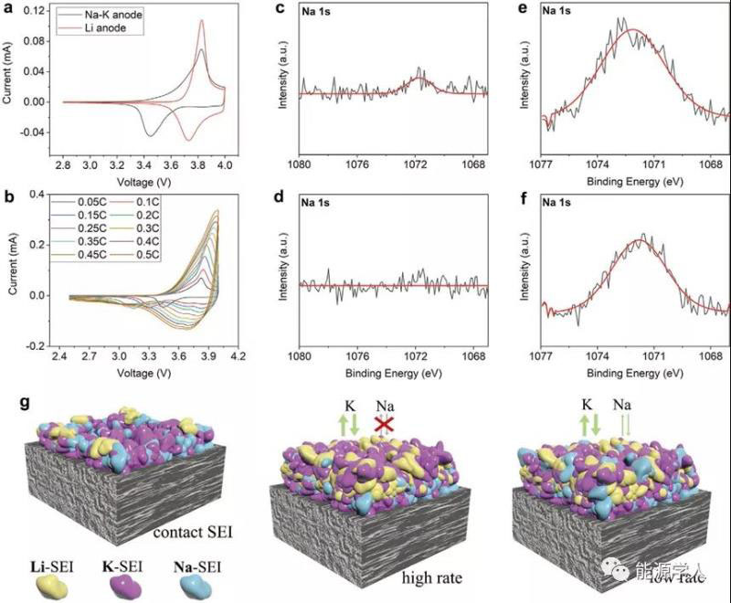圖4. (a) NMC/Na-K電池和NMC/Li電池在0.05C下的CV曲線,(b)NMC/Na-K電池在不同倍率下的CV曲線,(c–f)Na-K負極上形成的SEI的XPS結(jié)果,(g)不同倍率下不同SEI組分的示意圖