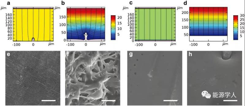 圖2. Li金屬(a,b)和Na-K合金(c,d)負極在原始(a,c)和還原(b,d)狀態(tài)下沉積的COMSOL多物理場模擬結(jié)果;Li對稱電池在循環(huán)前(e)后(f) Li表面和Na-K對稱電池在循環(huán)前(g)后(h) Na-K表面的SEM圖像