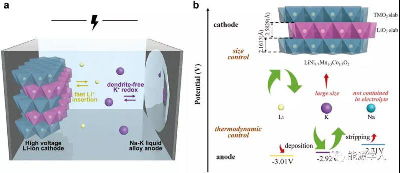 式中,E為反應(yīng)電勢,F(xiàn)為法拉常數(shù),n為電荷轉(zhuǎn)移數(shù)。如圖1b所示,在放電過程中,K+在Na+之前被氧化(?2.92 V<?2.71 V),而在充電過程中,K+在Li+之前被沉積(?2.92 V>?3.01 V)。對于正極,TMO2層和LiO2層交替堆疊,構(gòu)建了LiNi1/3Mn1/3Co1/3O2晶體,其中LiO2層的層間距為2.58 ?。Li+、Na+和K+的半徑分別為0.76、1.02和1.38 ?。由于沒有向電解液中添加鈉鹽,并且K+比正極中的Li+嵌入通道大(2.76 ?>2.58 ?),因此K+無法嵌入鋰中,從而實現(xiàn)了對Li+插層的控制。總體而言,整個電化學(xué)過程可根據(jù)負極和正極的熱力學(xué)偏好和尺寸限制進行調(diào)整,使無枝晶的LM電極和穩(wěn)定的鋰離子正極結(jié)合,這有望實現(xiàn)高容量。