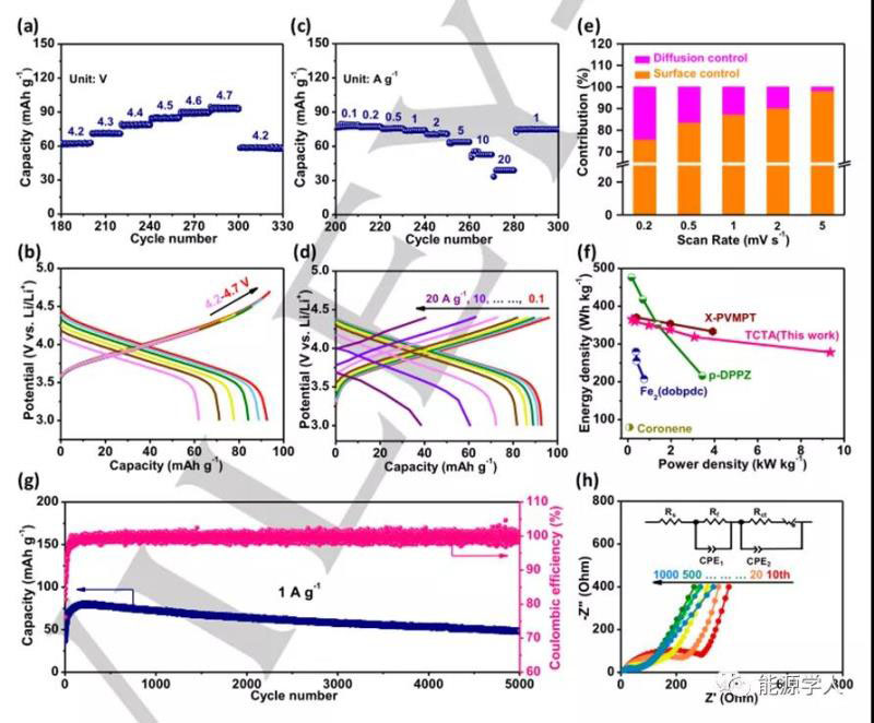圖3.(a)分別在4.2至4.7 V的不同截止電壓下TCTA正極的循環(huán)性能和(b)相應充電/放電曲線。(c)不同電流密度下TCTA正極的倍率性能和(d)相應充電/放電曲線。(e)在不同掃速下擴散控制和表面控制的容量貢獻率,(f)文獻中報道的TCTA和其他有機正極材料的性能比較,(g)TCTA正極在1 A g-1下的長期循環(huán)性能,(h)在500 mA g-1時不同周期的TCTA正極的EIS譜(內部:等效擬合電路)。