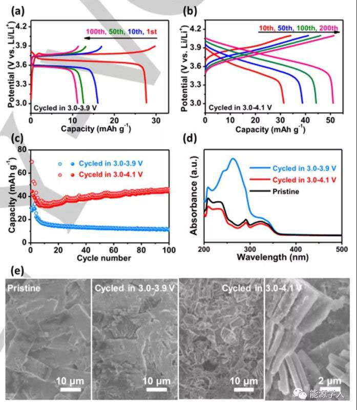 圖2. TCTA正極在不同電壓窗口的恒電流充/放電曲線(a)3.0-3.9 V,(b)3.0-4.1 V(c)相應的200 mA g-1電流密度下的循環(huán)穩(wěn)定性,(d)不同對比樣品UV-vis光譜和(e)非原位SEM圖像。