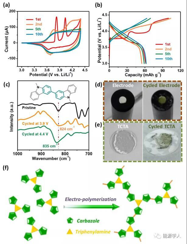圖1 (a)0.1 mV s-1時的CV曲線(b)TCTA正極在200 mA g-1時的恒電流充/放電曲線,(c)TCTA正極在3.9 V和4.4 V循環(huán)前后的FT-IR光譜,(d-e)電化學循環(huán)前后的TCTA膜的示意圖,(f)電聚合過程的示意圖。
