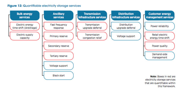 國際可再生能源機構(IRENA)發(fā)布的一份調(diào)查報告證明使用儲能容量作為電網(wǎng)電源備份可能會很棘手,因此儲能系統(tǒng)評估框架(ESVF)框架只考慮了可提供量化服務(參見下圖中的紅色方框)。