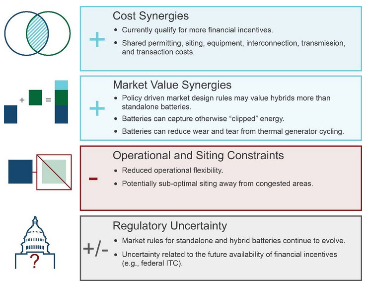 將可再生能源發(fā)電設(shè)施和電池儲能系統(tǒng)共址部署可以節(jié)省共享設(shè)備和互連成本,并可以充分利用有利于太陽能發(fā)電設(shè)施和電池儲能系統(tǒng)配套部署的美國聯(lián)邦稅收抵免政策。相對于獨(dú)立部署的發(fā)電設(shè)施,電力系統(tǒng)運(yùn)營商和購買者可能更喜歡應(yīng)用混合部署的發(fā)電設(shè)施,因?yàn)樗鼈兙哂懈蟮恼{(diào)度靈活性。但是將發(fā)電設(shè)施和電池儲能系統(tǒng)共址部署,可能并不總是一個最佳的解決方案。