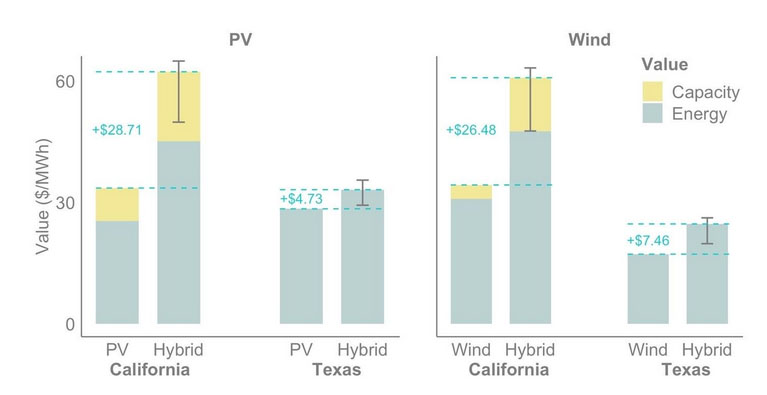 但是,能源開發(fā)商是否由于提供容量或只是采用可再生能源而獲得收益,這是混合部署能源設(shè)施能否獲得經(jīng)濟(jì)效益的一個重要因素。在電網(wǎng)規(guī)模的太陽能發(fā)電項(xiàng)目中,配套部署4小時電池儲能系統(tǒng)的成本為每兆瓦時4~14美元。但是,在加利福尼亞州的綜合能源和容量組合市場中,每兆瓦時的附加值可能高達(dá)13~31美元;但在德克薩斯州的電力市場中,每兆瓦時的附加值可能低至1~9美元。