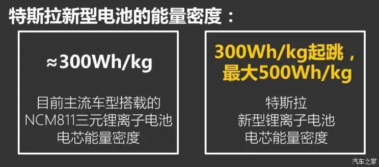 Maxwell公司的干電極技術(shù)可以使鋰電池電芯能量密度達(dá)到300Wh/kg以上,目前最大能達(dá)到500Wh/kg。相比起目前國(guó)內(nèi)常見(jiàn)的NCM811三元鋰離子電池電芯(NCM表示正極材料為鎳鈷錳三元材料,811表示鎳鈷錳成分的比例為8:1:1)最高約300Wh/kg的能量密度,特斯拉的新電池技術(shù)能量密度提升潛力更大。這在未來(lái)或?qū)⒋俪杉冸妱?dòng)車?yán)m(xù)航里程的一次飛躍。