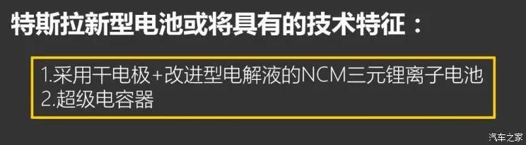 究竟特斯拉自造的電池會(huì)是怎樣的電池呢?特斯拉官方并未對(duì)外透露相關(guān)信息,但從特斯拉最近5年在動(dòng)力電池領(lǐng)域的布局來(lái)看,其自造的電池有可能是集成了改進(jìn)型鎳鈷錳三元鋰離子電池+超級(jí)電容,可以在不同的工況下充分發(fā)揮兩種儲(chǔ)能元件的優(yōu)勢(shì),提升電池放電功率和放電能力。其中的改進(jìn)型三元鋰離子電池或采用干電極技術(shù)以及改進(jìn)型電解液,可在容量以及循環(huán)壽命上得到顯著提升。