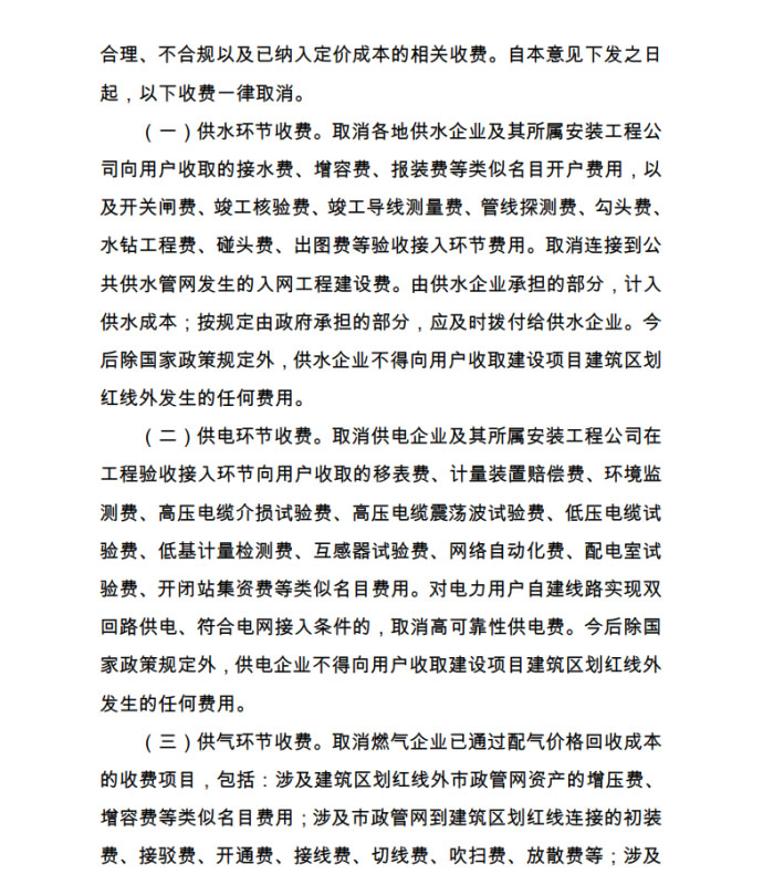 取消供電企業(yè)及其所屬安裝工程公司在工程驗(yàn)收接入環(huán)節(jié)向用戶收取的移表費(fèi)、計(jì)量裝置賠償費(fèi)、環(huán)境監(jiān)測費(fèi)、高壓電纜介損試驗(yàn)費(fèi)、高壓電纜震蕩波試驗(yàn)費(fèi)、低壓電纜試驗(yàn)費(fèi)、低基計(jì)量檢測費(fèi)、互感器試驗(yàn)費(fèi)、網(wǎng)絡(luò)自動(dòng)化費(fèi)、配電室試驗(yàn)費(fèi)、開閉站集資費(fèi)等類似名目費(fèi)用。對電力用戶自建線路實(shí)現(xiàn)雙回路供電、符合電網(wǎng)接入條件的,取消高可靠性供電費(fèi)。今后除國家政策規(guī)定外,供電企業(yè)不得向用戶收取建設(shè)項(xiàng)目建筑區(qū)劃紅線外發(fā)生的任何費(fèi)用。
