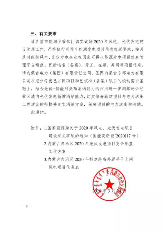 近日,國家能源局發(fā)布了《國家能源局關(guān)于2020年風(fēng)電、光伏發(fā)電項目建設(shè)有關(guān)事項的通知》(國能發(fā)新能[2020]17號,以下簡稱17號文件),為抓好內(nèi)蒙古自治區(qū)2020年風(fēng)電和光伏發(fā)電行業(yè)管理,持續(xù)推動內(nèi)蒙古自治區(qū)風(fēng)電、光伏發(fā)電科學(xué)有序健康發(fā)展,內(nèi)蒙古自治區(qū)能源局將國家能源局通知轉(zhuǎn)發(fā)各盟市,并結(jié)合自治區(qū)發(fā)展實際,提出了2020年風(fēng)電和光伏發(fā)電項目建設(shè)的具體要求。