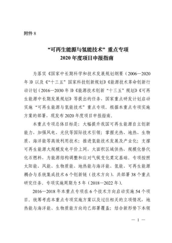 其中,第八部分是《“可再生能源與氫能技術(shù)”重點專項2020年度項目申報指南》。該項目共部署38個重點研究任務,專項實施周期為5年,即2018-2022年。2020年擬在氫能、太陽能、風能、可再生能源耦合與系統(tǒng)集成4個技術(shù)方向啟動14-28個項目,擬安排國撥經(jīng)費總概算為6.06億元。