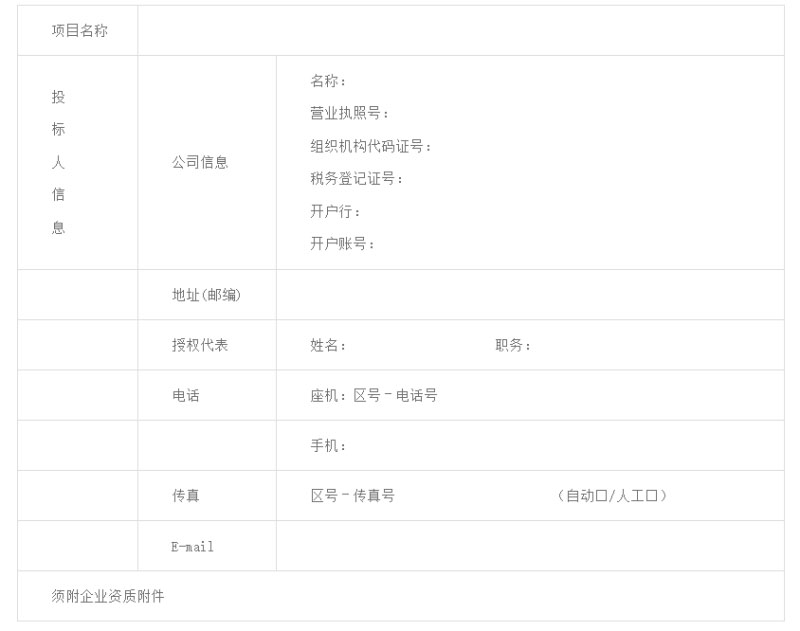 注:為了確保信息準(zhǔn)確無誤,請投標(biāo)人將此表格下載到電腦上,用黑體三號字認(rèn)真填寫表格中的每一項(xiàng)信息,如聯(lián)系方式錯(cuò)誤或缺失而導(dǎo)致投標(biāo)失敗,一切后果均由投標(biāo)人承擔(dān)。