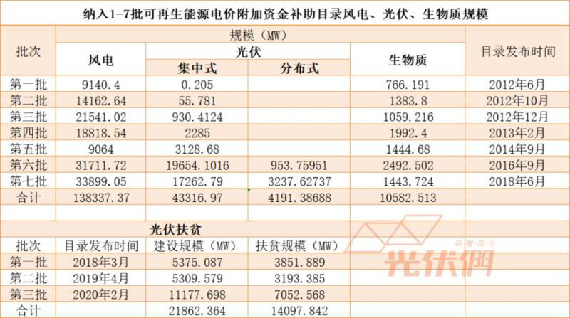 根據(jù)國(guó)家能源局?jǐn)?shù)據(jù),截止2019年底,我國(guó)光伏發(fā)電累計(jì)裝機(jī)容量達(dá)204GW,其中進(jìn)入1-7批補(bǔ)貼目錄的約有光伏61GW(含光伏扶貧)、風(fēng)電138GW。2018年6月財(cái)政部公布了第七批可再生能源補(bǔ)貼目錄,從2014年開始,各批次目錄發(fā)放的時(shí)間周期基本在兩年左右。