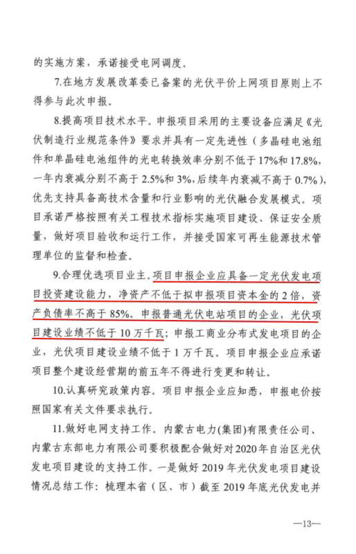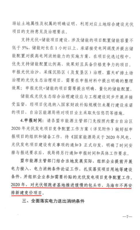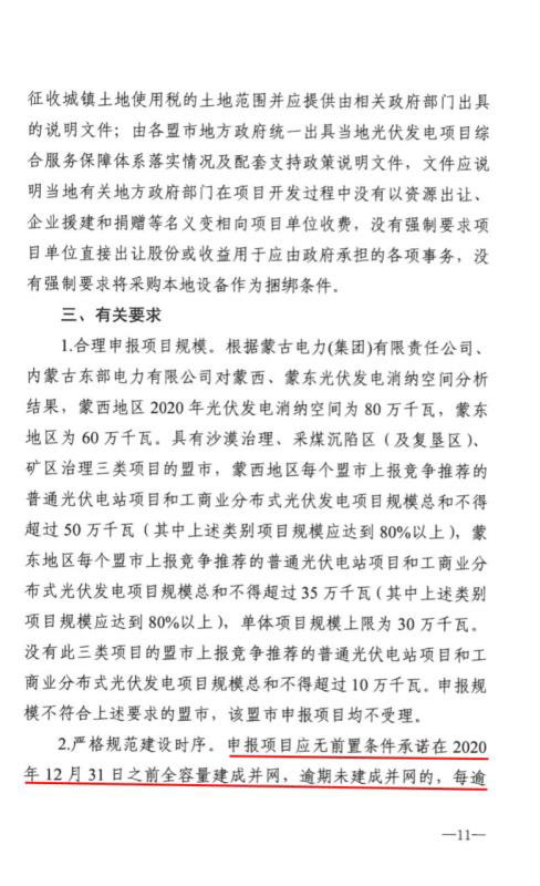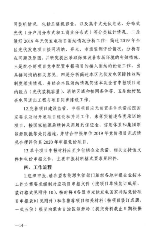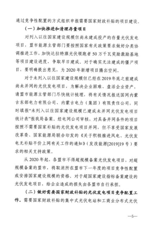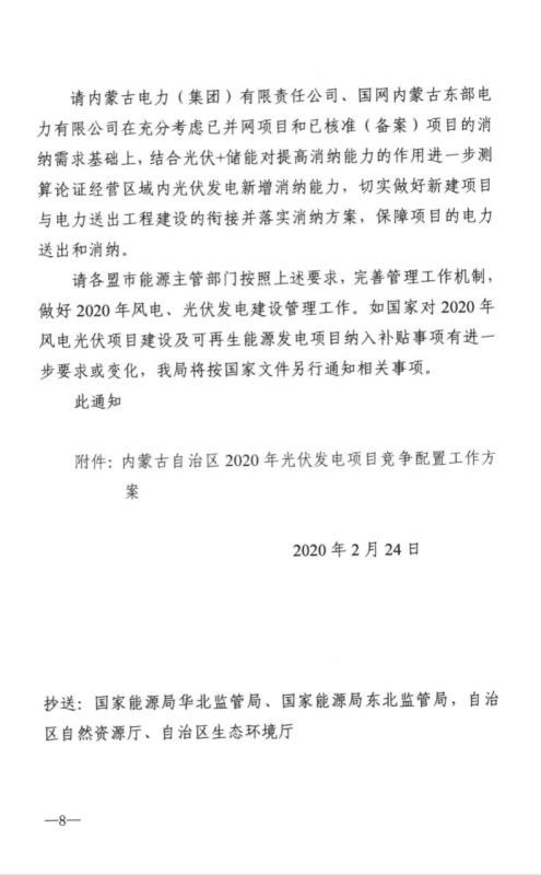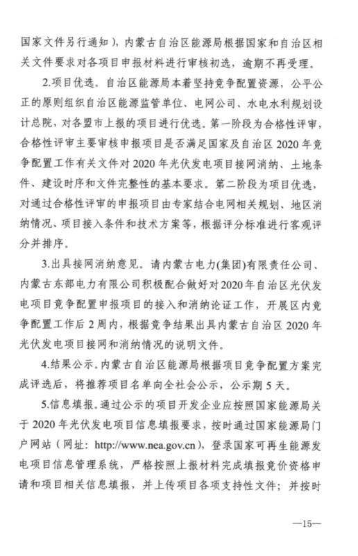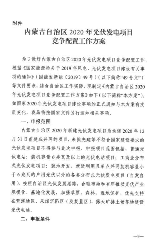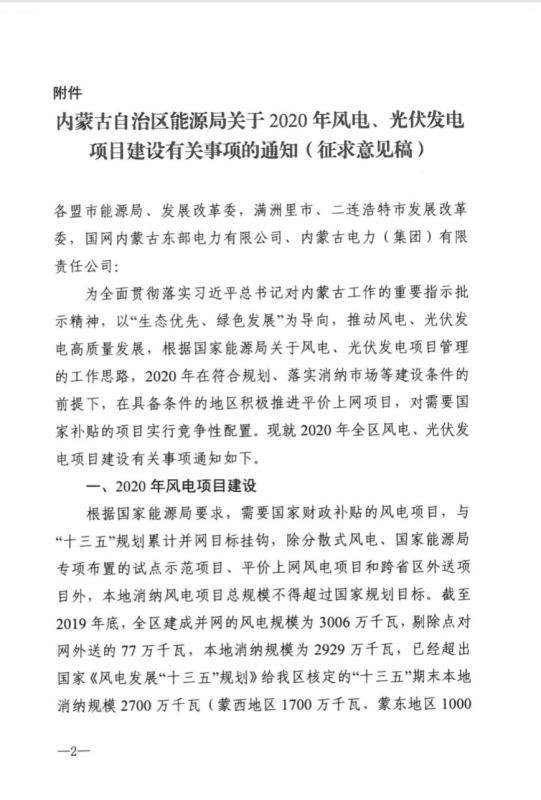 近日,內蒙古自治區(qū)能源區(qū)印發(fā)關于征求《2020年風電、光伏發(fā)電項目建設有關事項的通知(征求意見稿)》意見的函。2020年內蒙古自治區(qū)新增的光伏發(fā)電消納空間全部通過競爭性配置的方式組織申報需要國家財政補貼的項目建設。