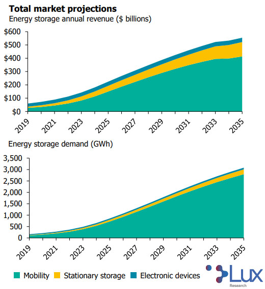 電動(dòng)汽車仍然是影響儲能年收入和市場裝機(jī)規(guī)模的長期驅(qū)動(dòng)因素,按年度收入計(jì)算,2035年其所占份額為74%,按裝機(jī)規(guī)模計(jì)算的份額為91%。而電子設(shè)備從2018年起開始成為儲能的第二大應(yīng)用領(lǐng)域,是固定式儲能領(lǐng)域的三倍之多,預(yù)計(jì)未來,該領(lǐng)域增長相對比較平穩(wěn),并且預(yù)計(jì)到2023年,將會被固定式儲能領(lǐng)域超過,屆時(shí),Lux Research認(rèn)為,固定式儲能領(lǐng)域的年收入將達(dá)到304億美元,裝機(jī)規(guī)模將達(dá)到52.5GWh。而這一增長趨勢則是主要受幾種關(guān)鍵的創(chuàng)新型技術(shù)(包括固態(tài)電池和液流電池)的商業(yè)化推動(dòng)而影響的。