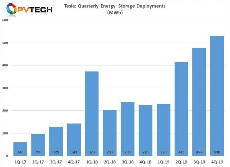 相比之下,特斯拉公司2019年的儲能部署情況(見下圖)更為樂觀。2019年第四季度部署的儲能系統(tǒng)容量為530MWh,創(chuàng)下季度最高記錄,而該公司2019年第一季度為229MWh,第二季度為415MWh,第三季度為477MWh。