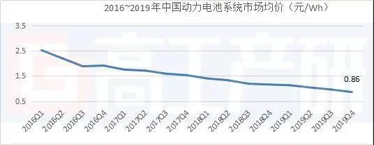 市場出現(xiàn)增量不增值的原因主要由于電池單體以及系統(tǒng)價格下降速度遠(yuǎn)大于電池單體出貨量增加速度。從季度價格走勢分布來看,2016-2019年整體價格呈現(xiàn)4%-10%不等的下降走勢,2019年電池單體價格下降走勢維持在5%-10%之間,較2018年下降幅度更大。2019年4季度動力電池系統(tǒng)不含稅價格為0.82~0.95元/Wh,較2018年4季度動力電池系統(tǒng)價格下降25.9%。GGII預(yù)測,2020年隨著電池系統(tǒng)集成化提升以及新工藝的使用,動力電池價格有望進一步下降。