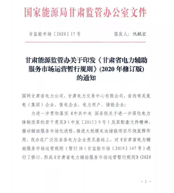 甘肅能監(jiān)辦為進一步推動輔助服務(wù)市場化進程,推進大規(guī)模電池儲能項目盡快發(fā)揮作用,現(xiàn)對《甘肅省電力輔助服務(wù)市場運行規(guī)則(暫行)》進行修訂,形成《甘肅省電力輔助服務(wù)市場運營暫行規(guī)則》(2020年修訂版)。