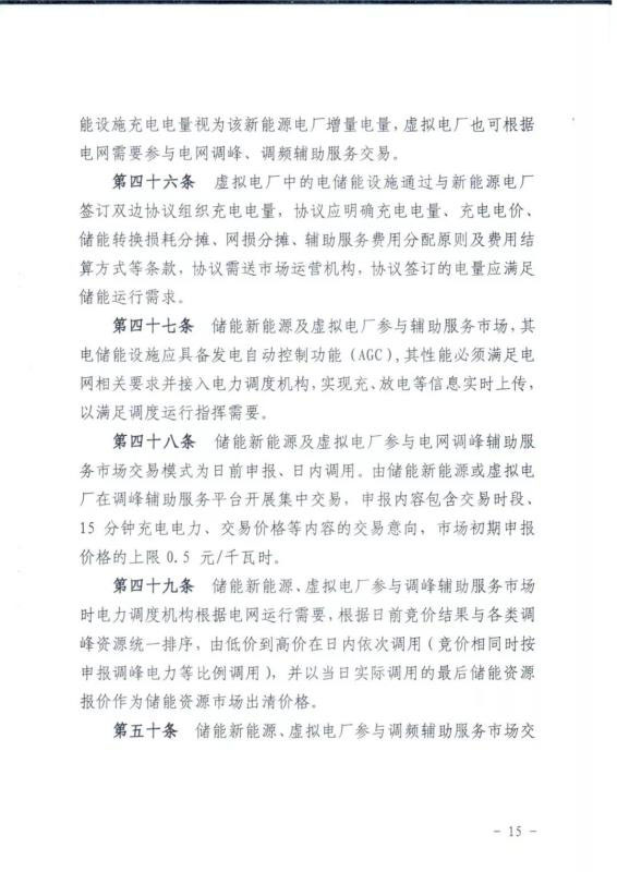 該文件指出,在新能源場站或虛擬電廠中的儲能設(shè)施參與調(diào)峰輔助服務(wù)交易,申報價格由原來2018年版本的上限價格0.2元/千瓦時、下限0.1元/千瓦時,2020年版提高到上限0.5元/千瓦時。另外2020年版本還新增調(diào)頻輔助服務(wù)市場交易內(nèi)容,電儲能資源在非棄風(fēng)棄光時段可參與調(diào)頻輔助服務(wù)市場,按調(diào)頻里程報價,上限為15元/兆瓦。文件定義在新能源場站計量出口內(nèi)建有儲能設(shè)施的新能源場站稱為儲能新能源,且電儲能設(shè)施與新能源場站視為整體,儲能充電能力在棄風(fēng)棄光時優(yōu)先使用,此部分充電電量視為新能源場站增量電量。