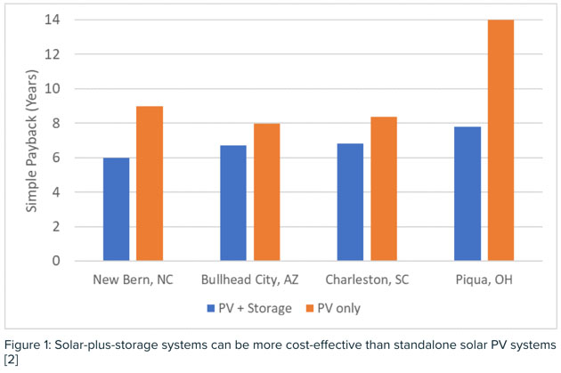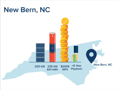 在像新伯爾尼這樣的城市中,商業(yè)需求收費(fèi)高(高于25美元/千瓦),加上使用時(shí)間費(fèi)率(TOU)結(jié)構(gòu),太陽(yáng)能+儲(chǔ)能項(xiàng)目可能是一項(xiàng)非常誘人的經(jīng)濟(jì)投資。其簡(jiǎn)單的投資回報(bào)期只有六年,甚至比獨(dú)立部署的太陽(yáng)能發(fā)電設(shè)施的回報(bào)期還少。對(duì)于北卡羅來納州一個(gè)典型的中型商業(yè)客戶來說,每年將節(jié)省15.5萬美元。