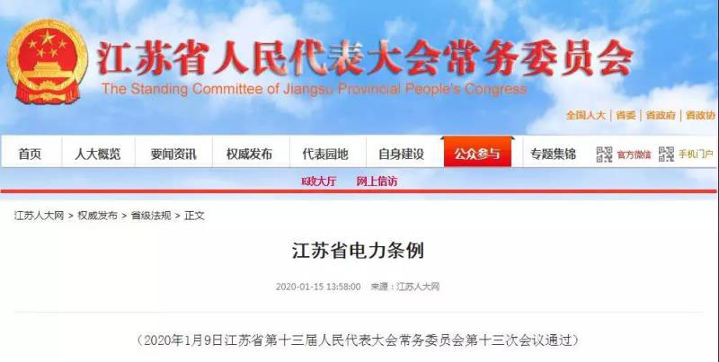 中國(guó)儲(chǔ)能網(wǎng)訊:1月15日,江蘇省人大常委會(huì)網(wǎng)站發(fā)布《江蘇省電力條例》,該《條例》將于5月1日施行。同時(shí)原《江蘇省電力保護(hù)條例》廢止。該《條例》指出“電力規(guī)劃應(yīng)當(dāng)引導(dǎo)智能電網(wǎng)和泛在電力物聯(lián)網(wǎng)發(fā)展”,“提高電網(wǎng)與發(fā)電側(cè)、需求側(cè)交互響應(yīng)能力,構(gòu)建源網(wǎng)荷儲(chǔ)協(xié)調(diào)發(fā)展、集成互補(bǔ)的能源互聯(lián)網(wǎng),促進(jìn)綜合能源服務(wù)等新業(yè)態(tài)發(fā)展”;其中源網(wǎng)荷儲(chǔ)友好互動(dòng)就指用戶自愿將儲(chǔ)能設(shè)施等接入電網(wǎng)實(shí)現(xiàn)與電源、電網(wǎng)互動(dòng)協(xié)調(diào),確保電網(wǎng)安全有序可靠運(yùn)行。全文如下: