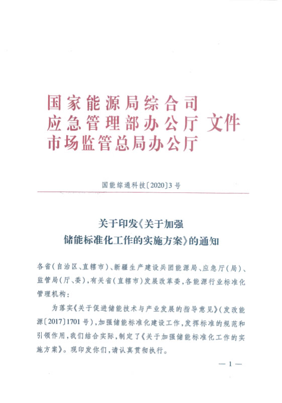 關(guān)于加強(qiáng)儲能標(biāo)準(zhǔn)化工作的實施方案