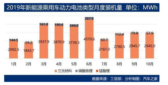 時至2019年,三元材料電池在新能源乘用車總裝機(jī)量中的占比已經(jīng)達(dá)到96%,前十個月累計裝機(jī)量達(dá)到30.89GWh,磷酸鐵鋰電池累計裝機(jī)量1.38GWh,另有少量錳酸鋰電池裝機(jī)。