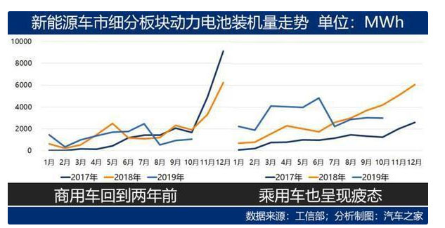 今年新能源商用車是有多涼,我們看幾個數(shù)字:2016年新能源商用車產(chǎn)量20萬輛,2017年26萬輛,2018年20萬輛,今年前十個月累計9萬輛出頭。新能源商用車今年的總產(chǎn)量預(yù)計基本就固定在10萬輛的天花板上了,那些專供商用車的電池企業(yè),日子很是不好過。