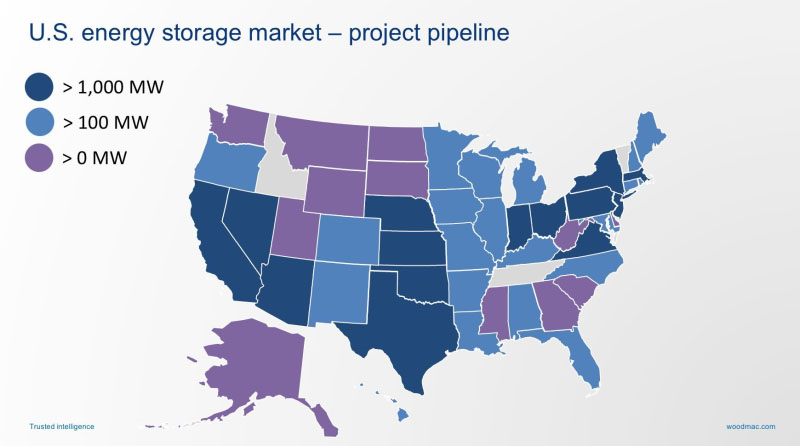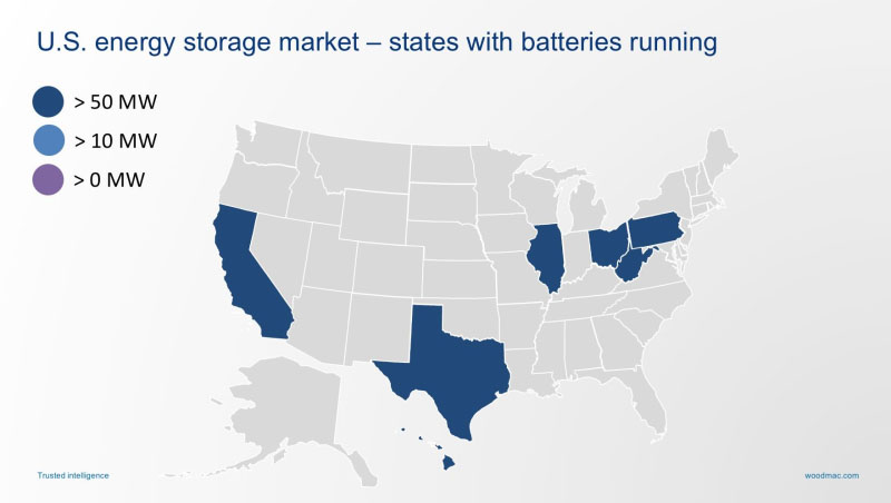 調(diào)研機構(gòu)Wood Mackenzie公司儲能主管Daniel Finn-Foley表示,儲能技術(shù)在電網(wǎng)應(yīng)用中扮演著一些重要角色:頻率調(diào)節(jié)、提供容量、推遲電力線路升級改造、提高電網(wǎng)彈性、解決可再生能源間歇性等。電池儲能系統(tǒng)不依賴于特定地理位置的天氣模式或任何政策,并且已經(jīng)在美國各地能源部署中確立了自己的地位。